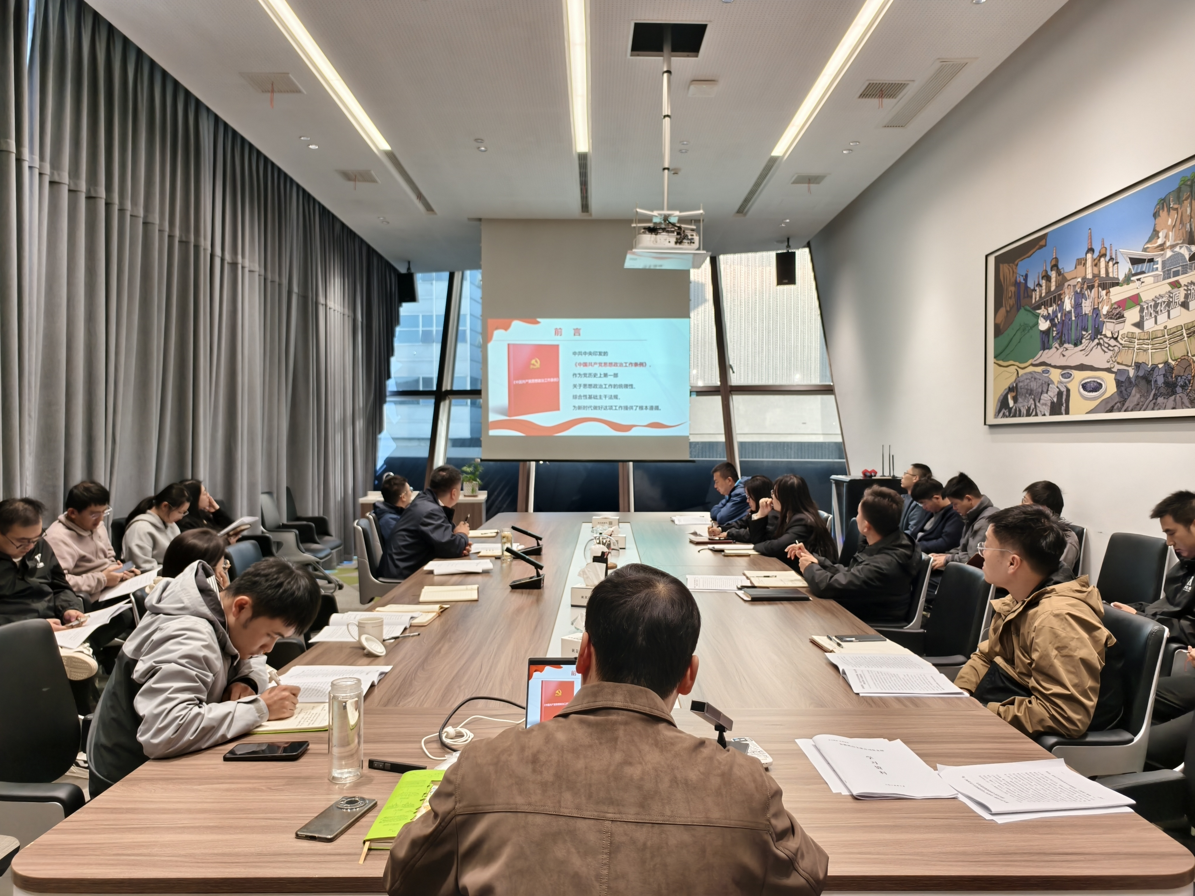 随后,支委委员陶飞同志以“深入学习贯彻《中国共产党思想政治工作条例》——为新时代伟大事业凝心聚力 充分认识条例出台的背景和意义”为主题,讲授了一堂严肃而生动的党课。从《条例》制定的时代背景、核心内容、推动《条例》落地见效的关键举措等方面展开讲解,强调思想政治工作是党的优良传统、鲜明特色和突出政治优势,要求全体党员干部职工将《条例》要求融入文旅项目推进、服务群众等实际工作,以思想引领汇聚企业发展合力。